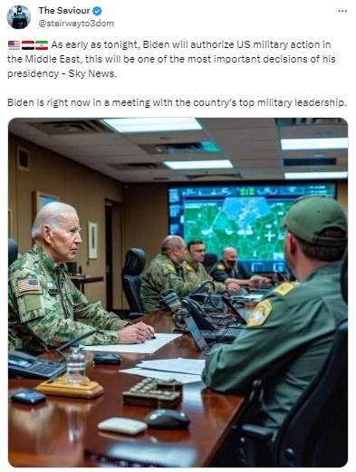 Several social media users are circulating a purported image of US President Joe Biden in military uniform at a national security council meeting, set to authorise military action in the Middle East. These images come against the backdrop of news reports stating that Biden has decided how the US will respond to a drone strike that killed three American troops in Jordan over the weekend. The archived version of the tweet can be seen here.