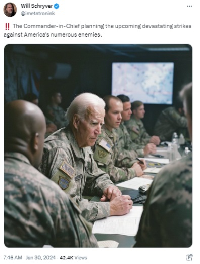 “AI-generated photos showing President Biden decked out in military gear in the Situation Room went viral Tuesday — amid Middle East tensions in the wake of the deadly drone attack on US soldiers. The images — on the heels of the Taylor Swift deepfakes scandal — were viewed thousands of times after first being posted on Elon Musk social media platform on Monday,” read the report.