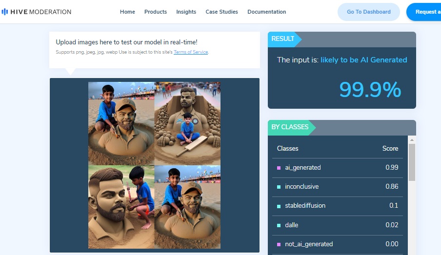 We then ran the image past Hive Moderator, an AI-generated content detection tool, which stated that there is a 99.9% chance of it being AI generated. A similar online tool, AI Or Not, stated that the image is likely AI-generated. Maybe’s AI Art Detector tool, too, said the image was 99% likely to be an AI-generated image.