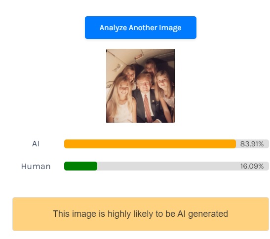 We then ran the image past Hive Moderator, an AI-generated content detection tool, which stated that there is only a 2.9% chance of it not being AI generated. A similar tool, Is it AI?, stated that the image is highly likely to be AI-generated. We also found a report by fact-checking outlet Snopes, dated July 14, 2023, confirming the image to be fake.