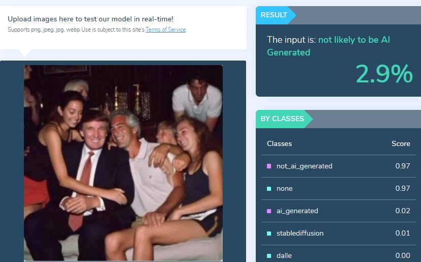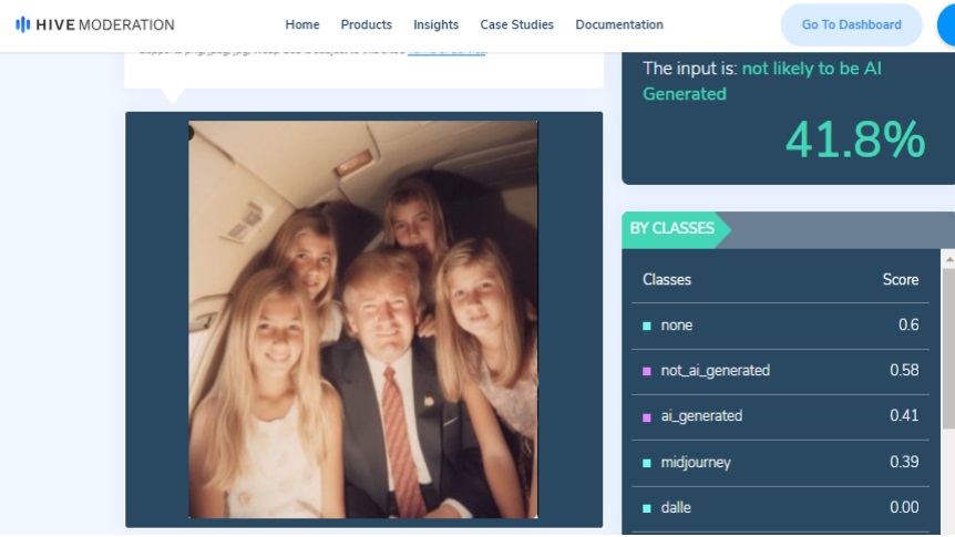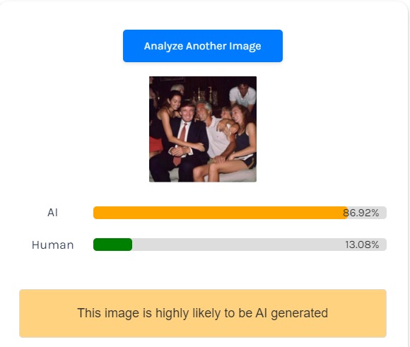 We ran the photos past Hive Moderator, which stated that image 3 was 99.9% likely to be AI-generated, while image 2 was 41.8% unlikely to be AI-generated. We ran image 2 past Is it AI?, which said the photo was highly likely to be AI-generated