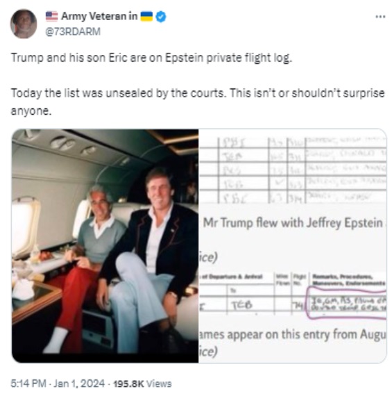 Photos of former US president Donald Trump with Jeffrey Epstein and young girls on flights to Epstein’s private island.