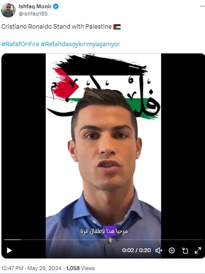 Several social media users are circulating a 24-second video message, purportedly showing Portuguese football player Cristiano Ronaldo voicing his support for the “children of Gaza.”