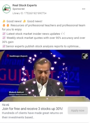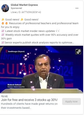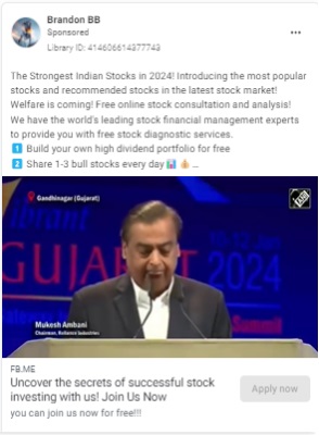 A viral advertisement of Mukesh Ambani promoting a stock market community forum was found to be a deepfake that leads users to a malicious website.