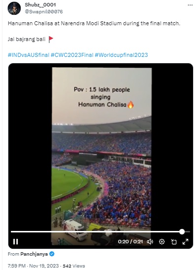 নৰেন্দ্ৰ মোডী ষ্টেডিয়ামত ভাৰত আৰু অষ্ট্ৰেলিয়াৰ মাজত অনুষ্ঠিত হোৱা আইচিচিৰ পুৰুষৰ বিশ্বকাপৰ ফাইনেলৰ সময়ত ডেৰ লাখ লোকে হনুমান চালিছা ধ্বনি দিয়াৰ দাবী কৰা ভিডিঅ’ সম্পাদনা কৰা হৈছে।