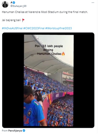 বিভিন্ন ছ’চিয়েল মিডিয়া ইউজাৰে শেহতীয়াকৈ এটা ভিডিঅ’ শ্বেয়াৰ কৰিছে, য’ত ২০২৩ চনৰ ১৯ নৱেম্বৰত আহমেদাবাদৰ নৰেন্দ্ৰ মোডী ষ্টেডিয়ামত অনুষ্ঠিত হোৱা ভাৰত আৰু অষ্ট্ৰেলিয়াৰ মাজত অনুষ্ঠিত হোৱা আইচিচিৰ পুৰুষৰ বিশ্বকাপৰ ফাইনেলৰ সময়ত প্ৰায় ১.৫ লাখ লোকে হনুমান চালিছা ধ্বনি দিয়া দেখা গৈছে বুলি কোৱা হৈছে। উল্লেখ্য যে এই মেচখনত অষ্ট্ৰেলিয়াই ভাৰতক পৰাস্ত কৰি সৰ্বাধিক ৬ বাৰৰ বাবে এদিনীয়া বিশ্বকাপৰ ট্ৰফী লাভ কৰে। ফে’চবুকত কৰা এই পোষ্টটো ইয়াত ক্লিক কৰি চাব পাৰিব।