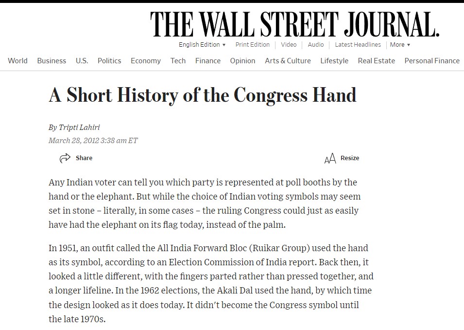 আমাৰ এই পৰীক্ষণকালতে ২০১৯ চনৰ ৫ এপ্ৰিলত প্ৰকাশিত ‘The Times of India ৰ আন এক প্ৰতিবেদনো পাইছিলোঁ, য’ত উল্লেখ আছে যে ১৯৫২ চনৰ পৰা ১৯৬৯ চনৰ ভিতৰত কংগ্ৰেছ দলৰ বাবে প্ৰতীক আছিল দুটা ষাড়গৰু একেলগে জোৰা লগোৱা। কিন্তু কংগ্ৰেছৰ সভাপতি এছ নিজালিংগাপ্পাই ইন্দিৰা গান্ধীক INC (R) দলৰ পৰা বহিষ্কাৰ কৰাৰ পিছত ইন্দিৰা গান্ধীয়ে নিজাকৈ এটা ফৈদ আৰম্ভ কৰিলে, তেতিয়া এই প্ৰতীকটো সলনি হৈ এটা গৰুৱে এটা পোৱালীক স্তনপান কৰাই থকা চিত্ৰলৈ পৰিণত হয়। ইফালে, মাত্ৰ কেইজনমান সাংসদ সদস্যৰে সীমিত সমৰ্থন থকা “পুৰণি কংগ্ৰেছে” যোৰ থকা দুটা ম’হৰ প্ৰতীককে ধৰি ৰাখিছিল। ১৯৭৭ চনৰ নিৰ্বাচনৰ পিছত কংগ্ৰেছ (আৰ) ফৈদৰ পৰা বিচ্ছিন্ন হৈ নতুন কংগ্ৰেছ (I) গঠন কৰাৰ পিছত ইন্দিৰা গান্ধীয়ে প্ৰথমে দলটোৰ বৰ্তমানৰ প্ৰতীক হাত ব্যৱহাৰ কৰিছিল।