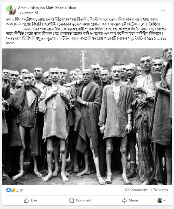 ফেচবুকত শেহতীয়াকৈ একাংশ অস্থি-চৰ্মসাৰ লোকৰ এখন কলা-বগা ফটো ভাইৰেল হৈ পৰিছে। ফটোখনৰ সৈতে এটা দীঘলীয়া লেখাও সন্নিৱিষ্ট আছে। এই লেখাটোত দাবী কৰা হৈছে যে এই ফটোখন ১৯৪৬ চনত একাংশ ইউৰোপ বিতাৰিত ইহুদী লোকৰ। এই ফটোখনত দেখা লোকসকলে তেতিয়াৰ পেলেষ্টাইন চৰকাৰৰ ওচৰত খাদ্য আৰু বাসস্থানৰ বাবে প্ৰাৰ্থনা জনাই থকা বুলি দাবী কৰা হৈছে।