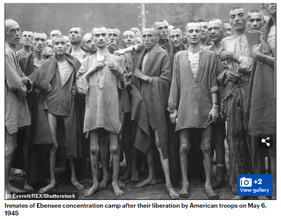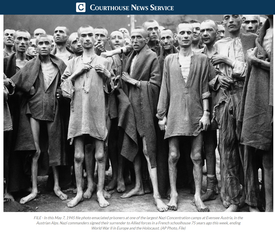ইফালে Courthouse News এ প্ৰকাশ কৰা এক প্ৰতিবেদনত সন্নিৱিষ্ট কৰা এই ফটোখনৰ সৈতে কেপশ্যন লিখিছে – FILE – In this May 7, 1945 file photo emaciated prisoners at one of the largest Nazi Concentration camps at Evensee Austria, in the Austrian Alps. Nazi commanders signed their surrender to Allied forces in a French schoolhouse 75 years ago this week, ending World War II in Europe and the Holocaust. (AP Photo, File) (FILE – এই ৭ মে, ১৯৪৫ ৰ ফাইল ফটোখনত অস্থিচৰ্মসাৰ বন্দীসকলক Evensee অষ্ট্ৰিয়া, অষ্ট্ৰিয়ান আল্পছৰ এটা বৃহত্তম নাজী কনচেনট্ৰেচন শিবিৰত দেখা গৈছে। নাজী সেনাপতিসকলে এই সপ্তাহটোতেই ৭৫ বছৰ পূৰ্বে ফ্ৰান্সৰ এটা স্কুলঘৰত মিত্ৰশক্তিৰ ওচৰত আত্মসমৰ্পণত স্বাক্ষৰ কৰি ইউৰোপত দ্বিতীয় বিশ্বযুদ্ধ আৰু নৰসংহাৰৰ অন্ত পেলাইছিল। (এ পি ফটো, ফাইল)