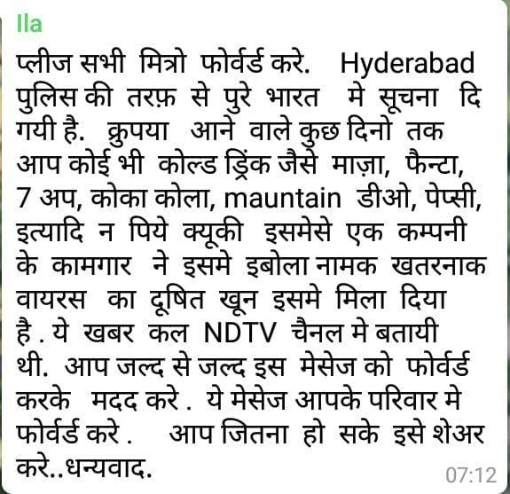 पेय पदार्थन के लेके कई साल से सोशल मीडिया पर तमाम तरह के दावा वायरल होत रहेला. अइसने एगो दावा कि ‘कोल्ड ड्रिंक में इबोला नामक वायरस से दूषित खून मिलल बा’, सोशल मीडिया पर पिछले कई साल से वायरल होत बा. बता दिहल जा कि वायरल तस्वीर के साथ पूर्व में कई अन्य फोटू भी शेयर कईल गईल रहल, जेकरे बाद Newschecker द्वारा हिंदी (1, 2), पंजाबी, बांग्ला तथा मराठी भाषा में ए दावा के फैक्ट चेक कईल जा चुकल बा. वायरल संदेश में ई दावा कईल गईल बा कि ई चेतावनी हैदराबाद पुलिस द्वारा जारी कईल गईल बा. लेकिन हैदराबाद पुलिस ने 13 जुलाई, 2019 के अपने आधिकारिक ट्विटर हैंडल से एगो ट्वीट शेयर कइके ये दावा के गलत बतवले रहल.