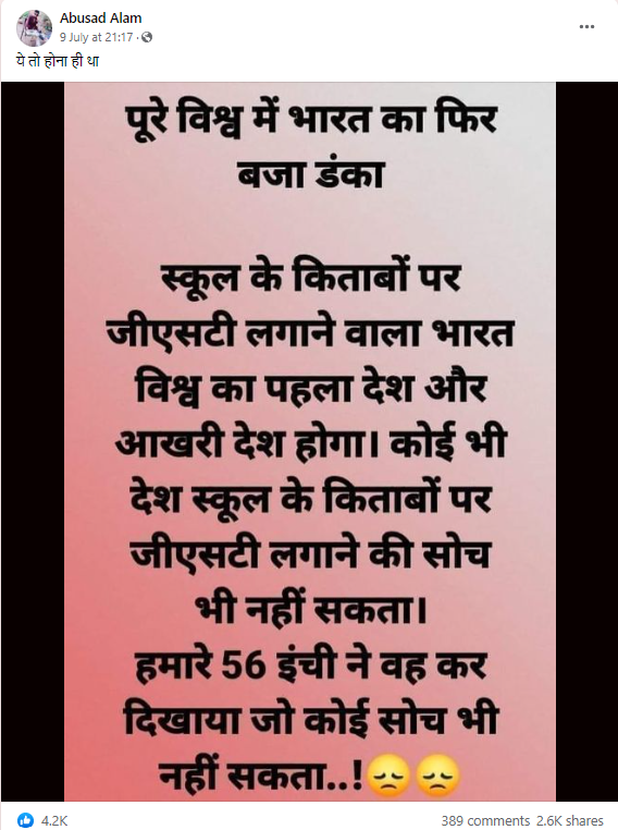 सोशल मीडिया पर ई दावा कईल जाला कि केंद्र सरकार द्वारा अब स्कूली किताबन पर भी GST लिहल जाईल.
