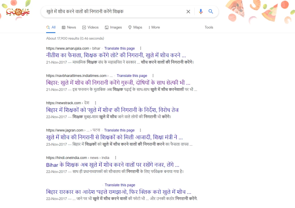 नवभारत टाइम्स के एगो रिपोर्ट के अनुसार, साल 2017 में बिहार के प्रखंड शिक्षा अधिकारी (ब्लॉक एजुकेशन ऑफिसर) ई आदेश दिहले रहले कि शिक्षक लोगन अब लईकन के पढवले के साथ-साथ खुला में शौच करे वालन के निगरानी भी करीहें.