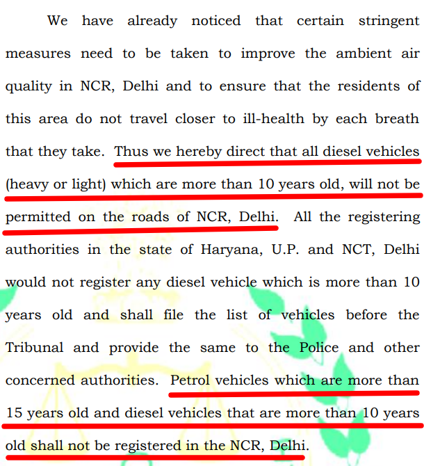 NGT के वेबसाइट पर मौजूद जानकारी के अनुसार 7 अप्रैल, 2015 के ट्रिब्यूनल द्वारा ई आदेश दिहल गईल रहल कि दिल्ली में 10 साल से पुरान डीजल तथा 15 साल से पुरान पेट्रोल गाड़िन पर प्रतिबंध लगा दिहल जा.