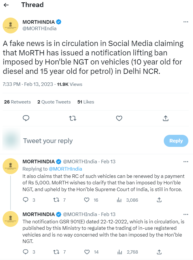 Twitter thread shared by MORTH, GoI on 13 February, 2023