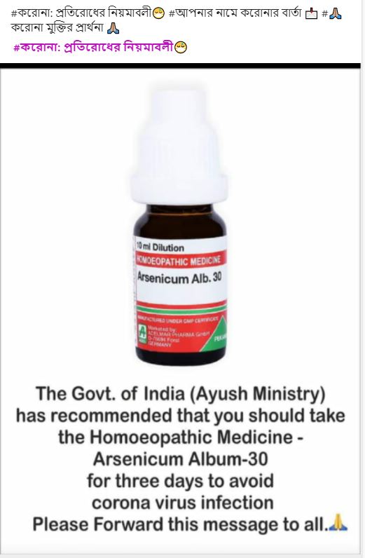 রোগপ্রতিরোধক ওষুধ আর্সেনিয়াম অ্যালবাম ৩০ কে নিয়ে সোশ্যাল মিডিয়াতে যে দাবি করা হহয়েছে তা সম্পূর্নই ভুল। করোনা প্রতিরোধে এই হোমিওপ্যাথি ওষুধের কোনো ভূমিকা নেই।
