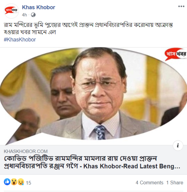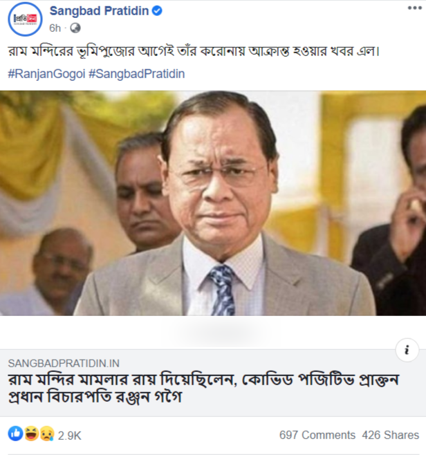 বাংলার প্রথম সারির সংবাদপত্র প্রতিদিন দাবি করেছে – প্রাক্তন প্রধান বিচারপতি শ্রী রঞ্জন গগৈ করোনাতে আক্রান্ত হয়েছেন। শুধু প্রতিদিন সংবাদপত্র নয়, খাস খবর, বাংলা ওয়ানইন্ডিয়া ও এই একই দাবি করে খবর ছেপেছে। নিচে এই খবরের স্ক্রিনশট দেওয়া হলো। বাবরি মসজিদের ধ্বংস স্তুপের স্থানেই করা হবে রাম মন্দির -ভারতের এই ঐতিহাসিক সিদ্ধান্তের রায় দেন রঞ্জন গগৈ। এর পর তিনি অবসর গ্রহণ করেন।