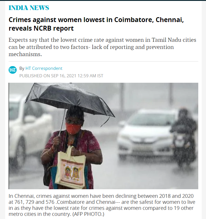 এই প্রসঙ্গে আমরা Hindustan Times এর একটি রিপোর্ট পেয়েছি যেখানে কলকাতা নয়, মহিলাদের বিরুদ্ধে কম অপরাধের শহর বলে আখ্যা দেওয়া হয়েছে তামিলনাড়ুর কোয়েম্বাটরকে।