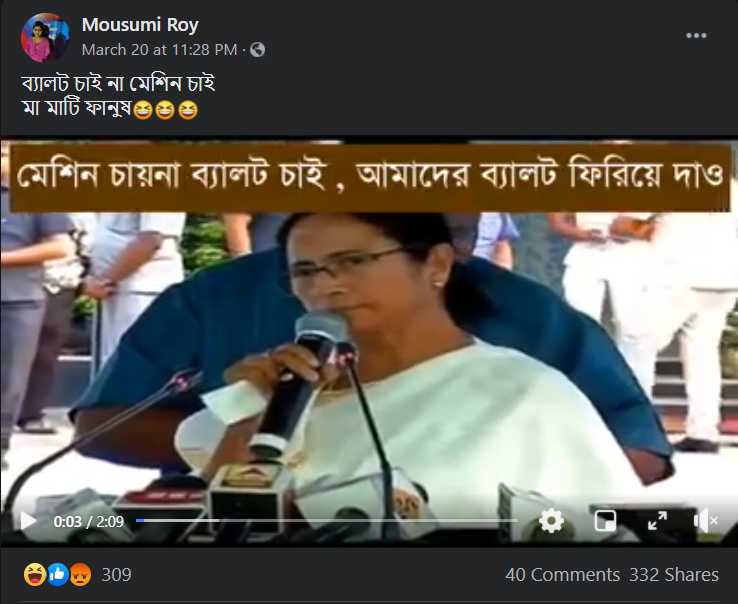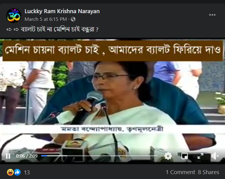 মমতা ব্যানার্জীর(Mamata Banerjee) মেশিন(EVM) নয়, ব্যালট(Ballot) ভোট চাই এই দাবিতে যে ভিডিওটি ফেসবুকে ভাইরাল হয়েছে সেই ভিডিওটি পুরোনো।বর্তমানের পরিস্থিতির সাথে এই ভিডিওটির কোনো যোগ নেই। ভিডিওটির থেকে কীওয়ার্ড বেছে নিয়ে গুগলে খোঁজার পর জানতে পারি এটি ২০১৯ সালের লোকসভা নির্বাচনের সময়ের ভিডিও।