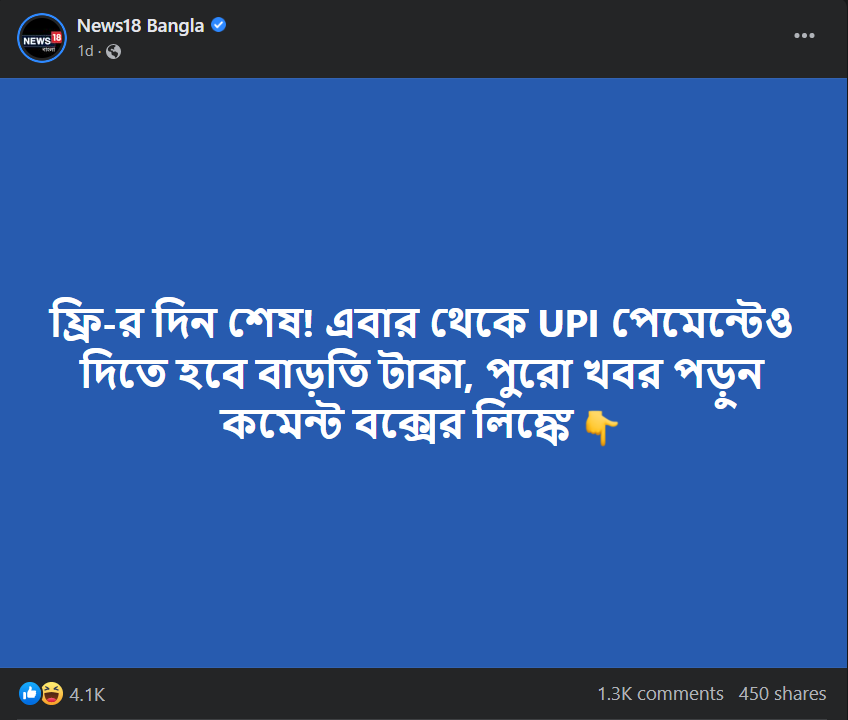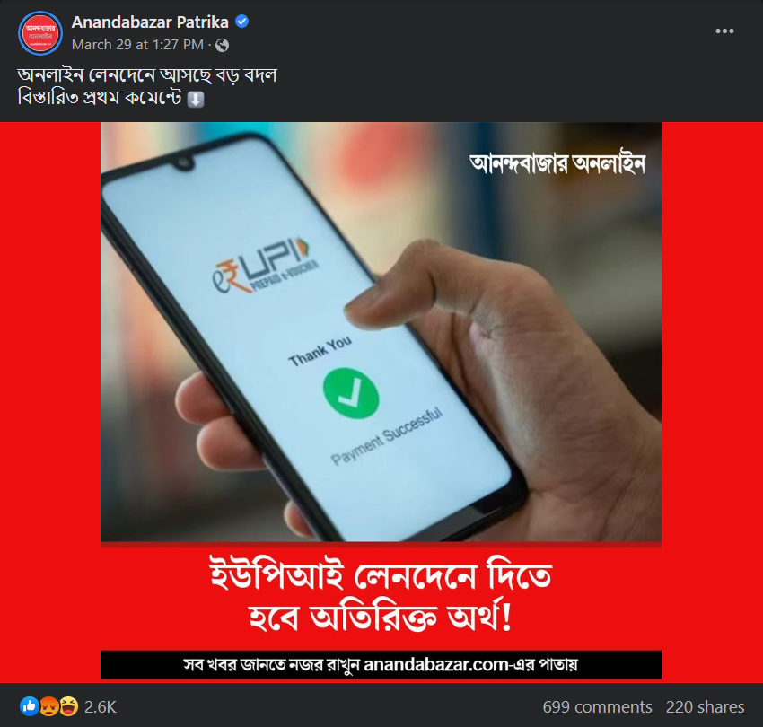সোশ্যাল মিডিয়াতে ভাইরাল দাবি এবার থেকে UPI দ্বারা আর্থিক লেনদেন করলে দিতে হতে পারে বাড়তি শুল্ক। খবর ছড়িয়েছে নিউজ ১৮ বাংলা, আনন্দবাজার পত্রিকার মতো বিশস্ত সংবাদমাধ্যমের দ্বারা যেখানে তাদের সংবাদের শিরোনামে বলা হয়েছে – ১লা এপ্রিল থেকে আর ফ্রীতে করা যাবে না UPI লেনদেন, দুই হাজার টাকার বেশি লেনদেনের ক্ষেত্রে ১.১% চার্জ দিতে হবে।