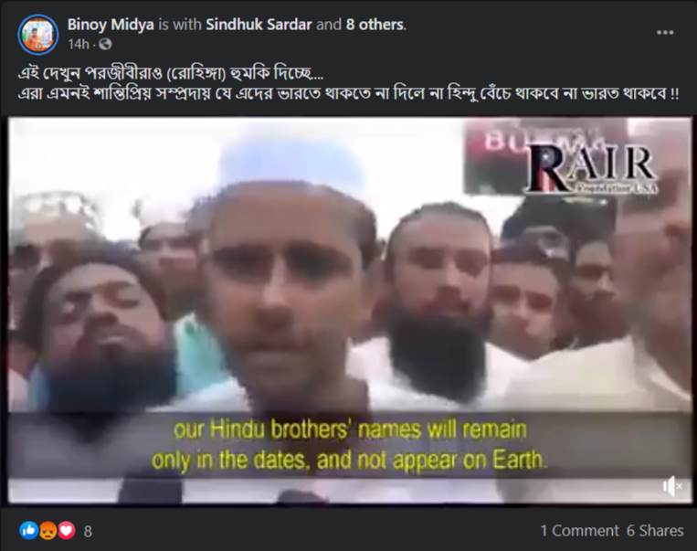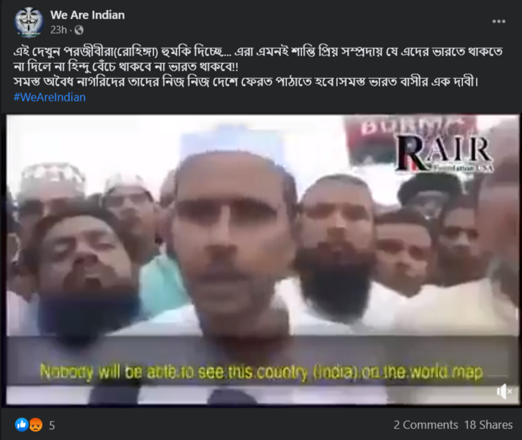 সোশ্যাল মিডিয়াতে ভাইরাল ভিডিও যা শেয়ার করে বলা হচ্ছে রোহিঙ্গা মুসলিমরা ভারতে থাকতে না পারলে হিন্দুদের হত্যা করবে, আসলে তা ২০১৭ সালের ভিডিও। রোহিঙ্গা মুসলিমদের সাথে পাকিস্তানের যোগসাযোগ আছে এই দাবিটির বিরুদ্ধে প্রতিবাদে নামে বিহারের কিছু মুসলিম সংগঠন। মায়ানমারে রোহিঙ্গা হত্যা ও মোদীর বিরুদ্ধে প্রতিবাদের এই ভিডিওটি বর্তমানে সোশ্যাল মিডিয়াতে ভুল দাবি নিয়ে শেয়ার হচ্ছে।