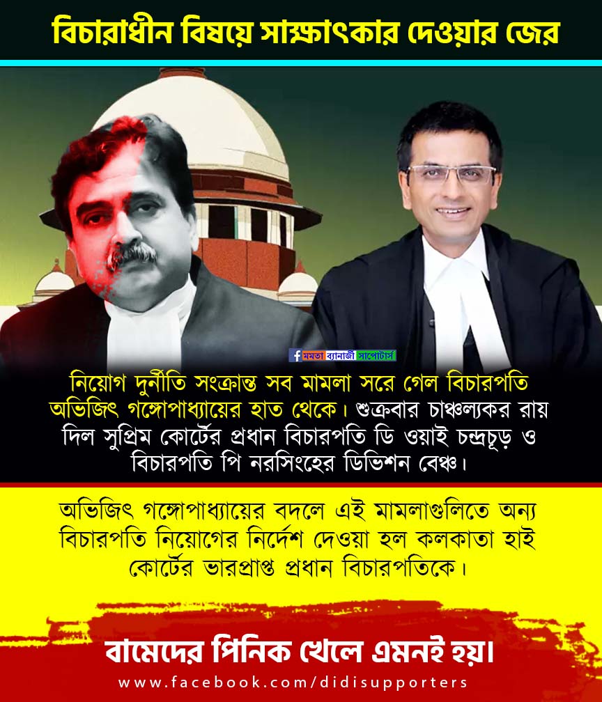 ফেসবুকে সম্প্রতি একটি পোস্ট ভাইরাল হয়েছে যেখানে দাবি করা হয়েছে – বিচারপতি অভিজিৎ গঙ্গোপাধ্যাযে এজলাস থেকে নিয়োগ দুর্নীতির সমস্ত মামলা সরানো হয়েছে সুপ্রিম কোর্টের নির্দেশে।