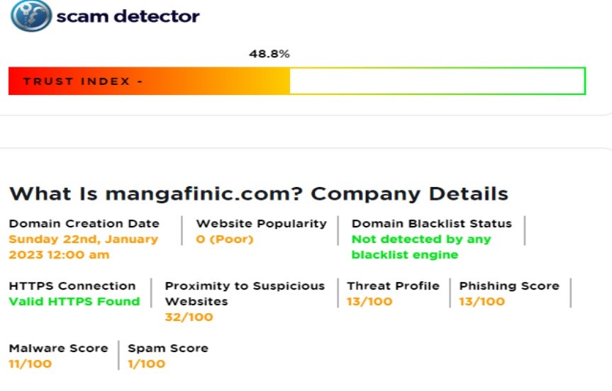 আমরা জানতে পারি যে “mangafinic.com” ওয়েবসাইটটি সন্দেহজনক এবং জালিয়াতি প্রতিরোধকারী অগ্রণী সংস্থা Scam Detector দ্বারা ওই ওয়েবসাইটটিকে ইতিমধ্যেই “সন্দেহজনক” হিসাবে চিহ্নিত করা হয়েছে৷