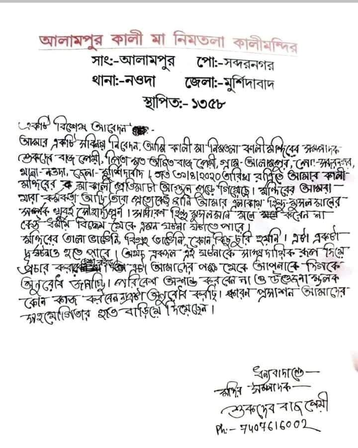 মুর্শিদাবাদের আলমপুরের নিমতলার কালী মন্দিরের বিগ্রহে অগ্নিসংযোগ নিছকই একটি দুর্ঘটনা। ফেসবুকে শেয়ার হওয়া এই পোস্টের কমেন্ট বক্সে আমরা ঐ মন্দিরের নাম ও ঠিকানা ছাপা হাতে লেখা একটি বয়ান পাই। মন্দির কর্তৃপক্ষের তরফ থেকে জানানো হয়েছে মন্দিরের এই ঘটনাটি দুর্ঘটনায় হতে পারে কারণ মন্দিরের তালা ভাঙা হয়নি, মন্দিরের আসবাবের কোনো ক্ষয়ক্ষতি পর্যন্ত হয়নি না কিছু চুরি হয়েছে। আরো বলা হয়েছে এই মন্দিরের সাথে যুক্ত প্রত্যেকেই জানে যে আলমপুরের নিমতলার এলাকায় হিন্দ-মুসলিমদের মধ্যে সৌহার্দ্যপূর্ণ সম্পর্ক রয়েছে। কেউ ইচ্ছাকৃত ভাবে এই ঘটনাকে সাম্প্রদায়িক রূপ দিতে চাইছে। বয়ানের শেষে মন্দিরের সম্পাদক শুকদেব বাজপেয়ীর নাম সই করা আছে।