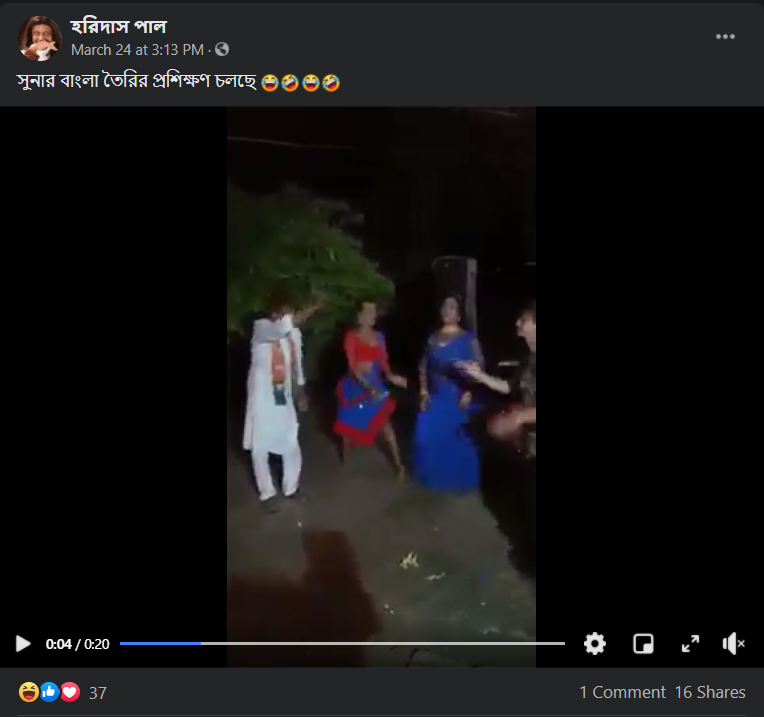 রাস্তায় নাচতে শুরু করল বিজেপি কর্মী এই দাবি সমেত এই ভিডিওটি ফেসবুকে যথেষ্ট ভাইরাল হয়েছে। ফেসবুকে ব্যবহারকারীরা এই ভিডিওটিকে পোস্ট করে বঙ্গের ভোটে বিজেপির স্লোগান সোনার বাংলা তৈরী হবে- এই স্লোগানটিকে বেশ মস্করার করার ভঙ্গিতে শেয়ার করা হয়েছে।