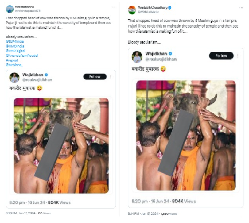 মধ্যপ্রদেশের রতলাম জেলার জওরা জেলার একটি মন্দিরে গোমাংস ফেলে যাওয়ার অভিযোগ উঠেছে চার জনের বিরুদ্ধে। সেই ঘটনার আবহে সোশ্য়াল মিডিয়ায় ছড়িয়েছে আরও একটি ছবি। যেখানে গরুর কাটা মাথা হাতে দেখা যাচ্ছে মন্দিরের পুরোহিতকে। ছবিটি মধ্যপ্রদেশের ওই ঘটনার সঙ্গে জুড়ে সোশ্যাল মিডিয়ায় ভাইরাল করা হচ্ছে।