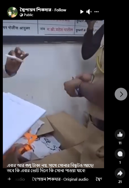সোশ্যাল মিডিয়ায় ছড়িয়েছে একটি ভিডিয়ো যেখানে অভিযোগ করা হয়েছে যে নির্বাচনে সোনার বিস্কুট বিলি করা হচ্ছে। যেহেতু ভিডিয়োতে বিজেপির পতাকা দেখতে পাওয়া যাচ্ছে তাই এটা স্পষ্ট যে অভিযোগের তির কেন্দ্রের শাসকদলের বিরুদ্ধে। ওই ভিডিয়োটি পোস্ট করে একজন ফেসবুকে লিখেছেন, “এবার আর শুধু টাকা নয়, সাথে সোনার বিস্কুটও আছে! তবে কি এবার ভোট দিলে কি সোনা পাওয়া যাবে”। (আর্কাইভ লিঙ্ক)