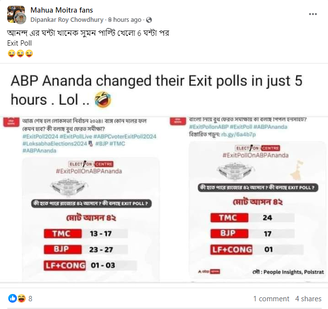 Fact: এবিপি আনন্দ তাদের বুথ ফেরত সমীক্ষা বা এক্সিট পোলের রিপোর্ট পরিবর্তন করেছে এই দাবিটি সত্যি নয়।