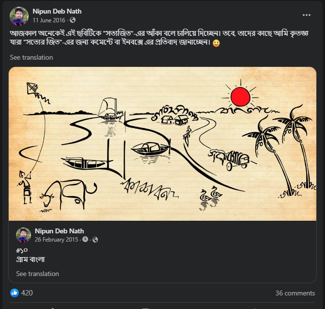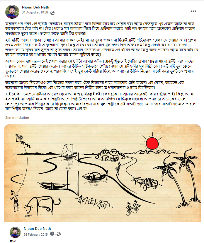 শুধু এই সময়ই নয়, শিল্পী নিপুন দেব নাথ নিজেই জানিয়েছেন, ছবিটি এর আগে ২০১৬ সালে রায়ের আঁকা হিসাবে ভাইরাল হয়েছিল। আপনি এখানে ক্লিক করে যে পোস্ট দেখতে পারেন।