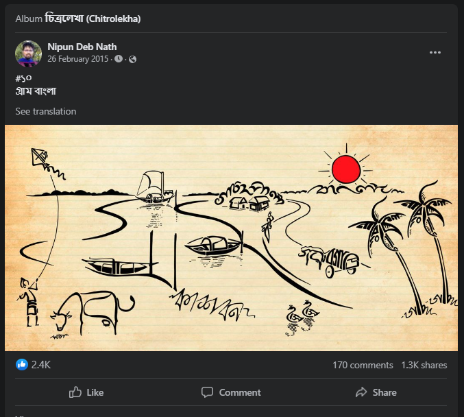 এই মূল পোস্টটিই আমাদের ২০১৫ সালে ২৬ শে জানুয়ারী শিল্পী নিপুণ দেবনাথের একটি পুরানো পোস্টে নিয়ে যায়, যেখানে শিল্পী এই ছবিটি গ্রাম বাংলা শিরোনামে পোস্ট করেছেন। এরপর আমরা শিল্পীর প্রোফাইল পরীক্ষা করি। সেখানে আমরা দেখতে পাই যে শিল্পী এই ছবিটি সম্পর্কে একটি পোস্ট লিখেছেন।