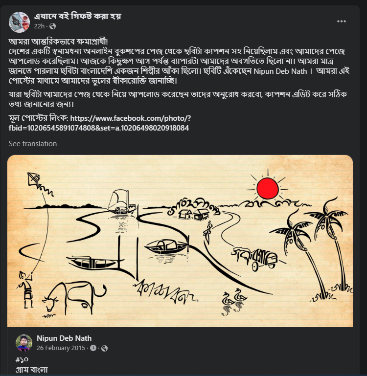 নিউজচেকার “সত্যজিৎ রায়ের আঁকা ছবি” কীওয়ার্ড দিয়ে ফেসবুকে সার্চ করি। সেখানে আমরা এখানে বই গিফট করা হয় নামে একটি ফেসবুক পৃষ্ঠায় এই ছবিটি-সহ একটি পোস্ট দেখতে পাই। যেখানে ফেসবুক পেজে ক্ষমা চেয়ে একটি পোস্ট করে মূল পোস্টের লিংক যুক্ত করা হয়। মূল পোস্টটি এখানে ক্লিক করে দেখা যাবে।