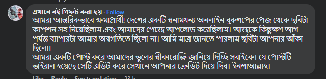 এই পোস্টের থ্রেডে দেখা যায়, এখানে বই গিফট করা হয় নামের যে ফেসবুক পেজে পোস্টটি ভাইরাল হয়েছে, সেখানেও শিল্পীর কাছে ক্ষমা চেয়ে একটি মন্তব্য লেখা হয়েছে।