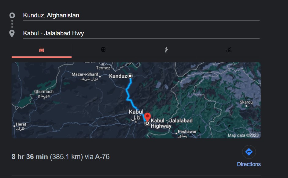 এর পরে, আমরা কুন্দুজ থেকে জালালাবাদ পর্যন্ত এক্সপ্রেসওয়ে সম্পর্কে ইন্টারনেটে অনুসন্ধান করেছি কিন্তু কোনও স্পষ্ট তথ্য পাইনি। যাইহোক, ইন্টারনেটে উপলব্ধ তথ্য অনুসারে, দু’টি স্থানের মধ্যে দূরত্ব ৩৮৫.১ কিলোমিটার।