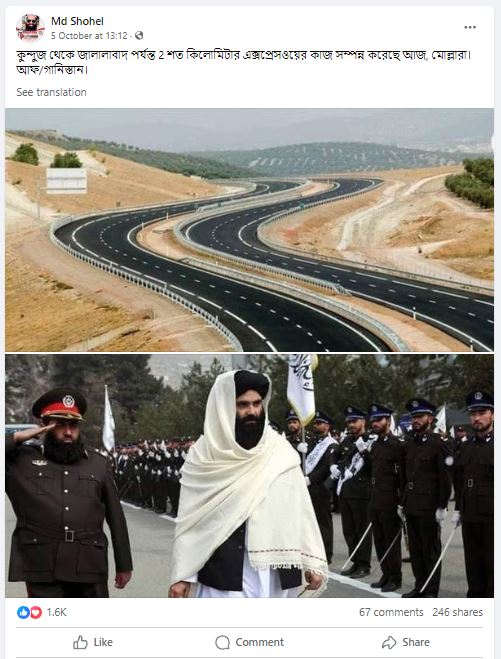 সম্প্রতি, একটি সুন্দর হাইওয়ের ছবি সোশ্যাল মিডিয়ায় ভাইরাল হয়েছে। সেটি আফগানিস্তানে নতুন নির্মিত এক্সপ্রেসওয়ের ছবি বলে দাবি করা হচ্ছে। বলা হচ্ছে, কুন্দুজ থেকে জালালাবাদ পর্যন্ত ২০০ কিলোমিটার রাস্তাকে এক্সপ্রেসওয়ে হিসেবে তৈরি করা হয়েছে। উল্লেখ্য যে, ২০২১ সালের অগাস্ট মাস থেকে তালিবানরা ফের আফগানিস্তান শাসন করা শুরু করেছে। এই সময়কালে আফগান রাজনীতি বিস্তর উত্থান-পতনের সাক্ষী। এমনই সন্ধিক্ষণে আফগানিস্তানে ব্যাপক উত্তরণ ঘটেছে বলে দাবি করে ওই রাস্তার ছবি ভাইরাল করা হয়েছে। পোস্টটি এখানে ক্লিক করে দেখা যাবে।