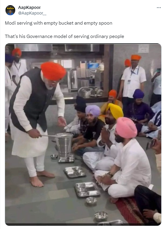 প্রধানমন্ত্রী নরেন্দ্র মোদির একটি ছবি সোশ্যাল মিডিয়ায় পোস্ট করে অনেকেই দাবি করছেন যে, খালি বালতি ও হাতা-সহ গুরুদোয়ারাতে খাবার পরিবেশনের নাটক করছেন তিনি। ছবিটি এক্স হ্যান্ডেলে পোস্ট করে একজন লিখেছেন, “Modi serving with empty bucket and empty spoon That’s his Governance model of serving ordinary people”। (আর্কাইভ লিঙ্ক)