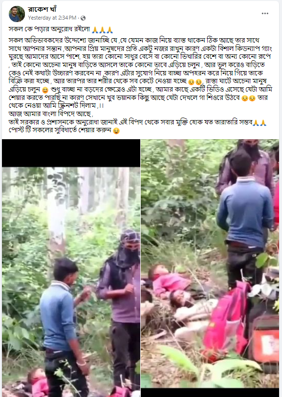 রাজ্যের বিভিন্ন জায়গায় শিশু চুরির ঘটনা বেড়ে গিয়েছে। বাচ্চাদের অপহরণ করে নিয়ে গিয়ে বিক্রি করা হচ্ছে এবং শরীরের অংশ কেটে দেওয়া হচ্ছে। (আর্কাইভ লিঙ্ক)