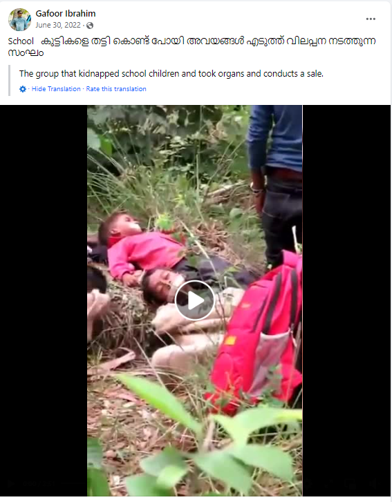 ছবিটির রিভার্স ইমেজ সার্চ করলে একই ধরনের, কিন্তু আরও বড় দৈর্ঘের একটি ভিডিয়ো আমাদের নজরে পড়ে। ২০২২ সালের ৩০ জুন যেটা ফেসবুকে পোস্ট করেছিলেন Gafoor Ibrahim নামের এক ব্যক্তি। পোস্টে লেখা ছিল, “একটি গ্রুপ যারা স্কুল পড়ুয়াদের অপহরণ করে এবং বিক্রি করে দেয়।”