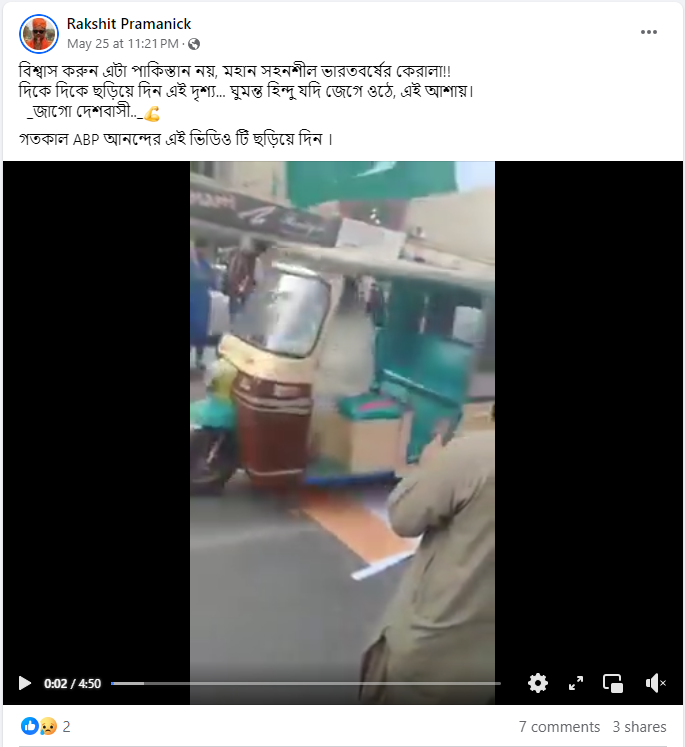 সোশ্যাল মিডিয়ায় একটি ভিডিয়ো পোস্ট করা হচ্ছে। যাতে দেখা যাচ্ছে, ব্যস্ত রাস্তায় ভারতের পতাকার উপর দিয়ে গাড়ি চলছে। ভিডিয়োটি কেরলের দাবি করে সোশ্যা মিডিয়ায় পোস্ট করা হচ্ছে। (আর্কাইভ লিঙ্ক)