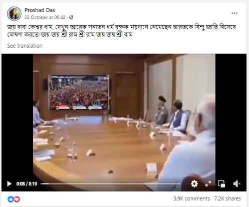 সম্প্রতি নরেন্দ্র মোদীর সভাপতিত্বে চলা একটি বৈঠকের ভিডিয়ো বিভিন্ন সোশ্যাল মিডিয়ায় ভাইরাল হয়েছে। ভিডিয়োটিতে দেখা যাচ্ছে প্রধানমন্ত্রী ও মন্ত্রিসভার অন্যান্য মন্ত্রীরা একটি বৈঠকে বসে আছেন এবং কোনও এক ধর্মগুরু তাঁদের সামনে একটি মনিটরে বক্তৃতা দিচ্ছেন। বৈঠকে সেনাকর্তারাও উপস্থিত ছিলেন। ধর্মীয় নেতাকে হিন্দু রাষ্ট্র গড়ার বিষয়ে বক্তৃতা দিতে শোনা যায়। ওই ধর্মীয় নেতা হলেন গুরু মহারাজ অনিরুদ্ধাচার্য। ভিডিয়োটি শেয়ার করা হয়েছে এই ক্যাপশন-সহ – “জয় বাবা কেশর ধাম, দেখুন কতজন সনাতন ধর্ম রক্ষাকারী ভারতকে হিন্দু জাতি হিসাবে ঘোষণা করতে মাঠে নেমেছে। জয় জয় শ্রী রাম, শ্রী রাম জয়, জয় শ্রী রাম।” আপনি এখানে ক্লিক করে তেমন একটি পোস্ট দেখতে পারেন।