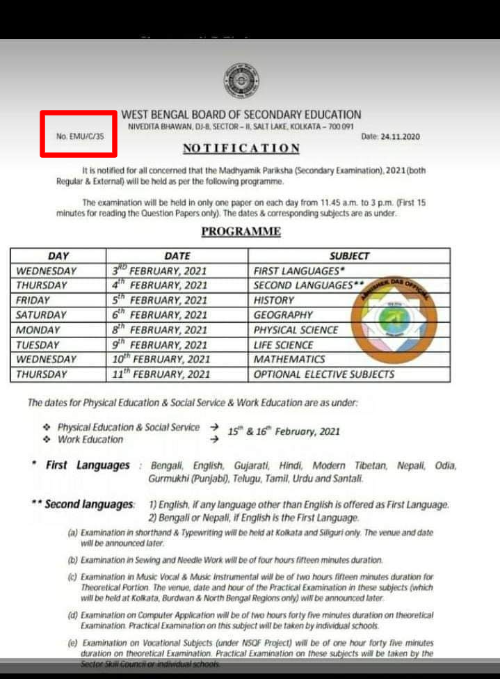 শুধু মাত্র করোনার জন্য দশম ও দ্বাদশ শ্রেণীতে প্রত্যেকটি বিষয়ে ৩০-৩৫% সিলেবাস কম করা হয়েছে। নতুন সিলেবাসে কি কি আছে তা এখানে এবং এখানে দেখা যেতে পারে। ২০২১ মাধ্যমিক পরীক্ষার যে রুটিনটি ভাইরাল হয়েছে তা সম্পূর্ণ জাল রুটিন। ২০২০ সালে দশম শ্রেণীর পরীক্ষার রুটিনে EMU নম্বর ৩৫ ছিল, ভাইরাল রুটিনেও সেই সংখ্যা এক। এছাড়াও রুটিনের শেষে কোনো মধ্যশিক্ষা পর্ষদের কর্তৃপক্ষের কোনো সাক্ষর নেই।