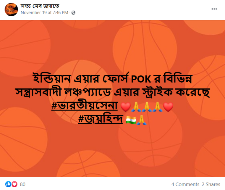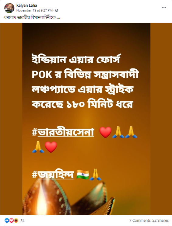 ভারতীয় সেনা POK বা পাকিস্তানের কব্জায় থাকা কাশ্মীরে ১৯ তারিখে কোনো হামলা বা এয়ার স্ট্রাইক করেনি। সোশ্যাল মিডিয়াতে ও সংবাদ মাধ্যমে প্রচারিত হলো ভুল খবর।