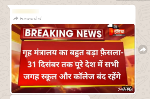 ৩১শে ডিসেম্বর পর্যন্ত কোনো স্কুল ও কলেজ বন্ধ রাখার নির্দেশিকা নেই স্বরাষ্ট্র মন্ত্রকের পক্ষ থেকে। সোশ্যাল মিডিয়াতে ভাইরাল হলো মিথ্যে খবর।