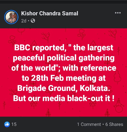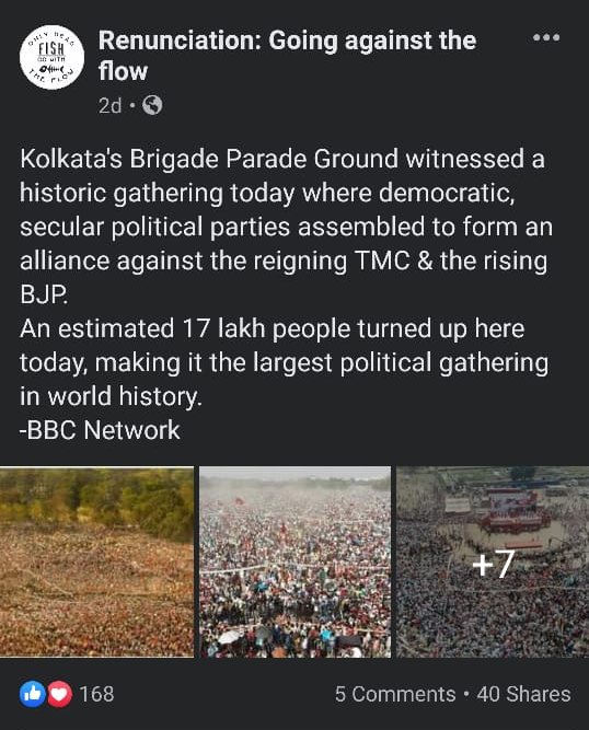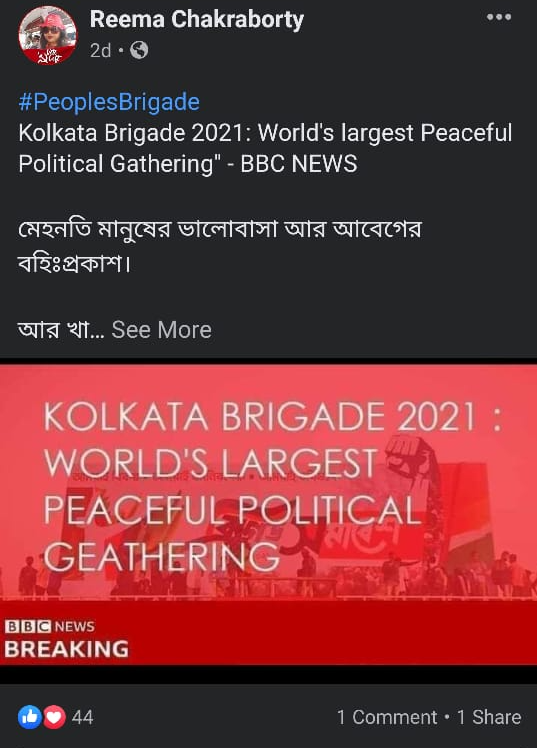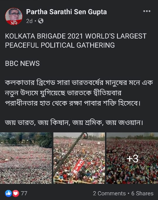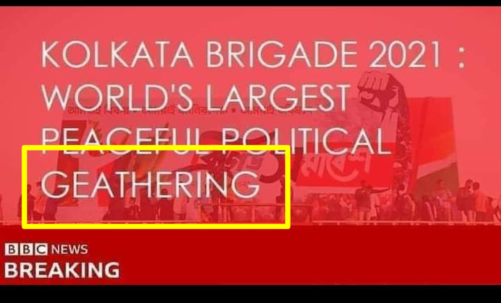২৮শে ফেব্রুয়ারি রবিবারে বামফ্রন্ট, কংগ্রেস ও ইন্ডিয়ান সেক্যুলার ফ্রন্টের ব্রিগেড নিয়ে সোশ্যাল মিডিয়াতে ছড়িয়েছে মিথ্যে খবর। বিবিসির থেকে এই জনসমাবেশকে বিশ্বের সেরা শালীন সমাবেশের তকমা দিয়েছে। কিন্তু এই দাবিটি সম্পূর্ণ ভুল, কারণ বিবিসির ওয়েবসাইট ২০২০ সালে কলকাতায় আম্ফানের খবর যা প্রকাশিত হয়েছিল ২৮সে মে, তারপর আর কোনো খবর প্রকাশিত হয়নি।