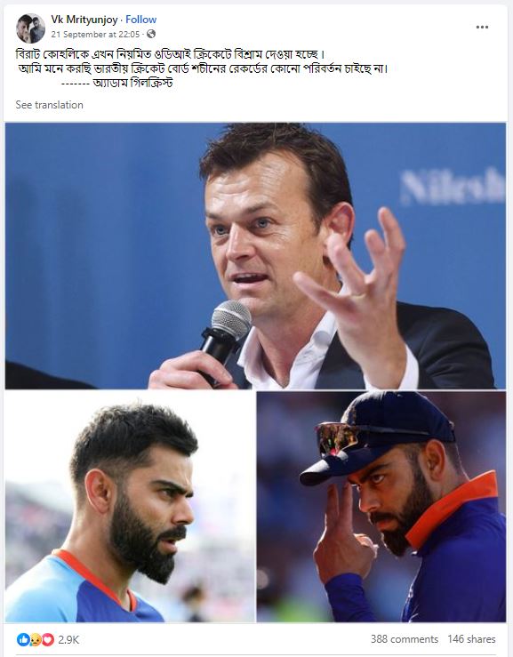 সম্প্রতি অনুষ্ঠিত এশিয়া কাপে পাকিস্তানের বিরুদ্ধে একদিনের আন্তর্জাতিকে তাঁর ৪৭তম সেঞ্চুরিটি করেছিলেন বিরাট কোহলি। এক দিনের ক্রিকেটে সবচেয়ে বেশি সেঞ্চুরির মালিক শচীন তেন্ডুলকারের নজির ভাঙতে কোহলি এখন মাত্র দু’টি শতক দূরে রয়েছেন। এমন পরিস্থিতেতে একটি ভাইরাল হওয়া পোস্টে দাবি করা হয়, অস্ট্রেলিয়ার প্রাক্তন ক্রিকেটার অ্যাডাম গিলক্রিস্ট বলেছেন যে- “বিরাট কোহলিকে এখন নিয়মিত ওডিআই ক্রিকেটে বিশ্রাম দেওয়া হচ্ছে। আমি মনে করছি ভারতীয় ক্রিকেট বোর্ড শচীনের রেকর্ডের কোনো পরিবর্তন চাইছে না। – অ্যাডাম গিলক্রিস্ট।” ভাইরাল পোস্টটি এখানে ক্লিক করলে দেখা যাবে।