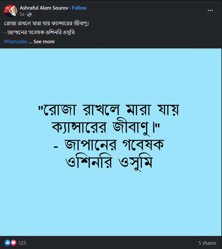 সারা বিশ্বজুড়ে পালিত হচ্ছে পবিত্র রমজান এবং এই আবহে ফেসবুকে ভাইরাল দাবি উপবাস বা রোজা রাখলে সেরে যেতে পারে ক্যান্সার। শরীরে ক্যান্সারের জীবাণু দানা বাধলে তা থেকে মুক্তি পাওয়া যেতে পারে উপবাস বা রোজা রাখলে, এমনটাই দাবি করেছেন অটোফেজিতে নোবেল জয়ী ডঃ ওসিনরি ওসুমি।