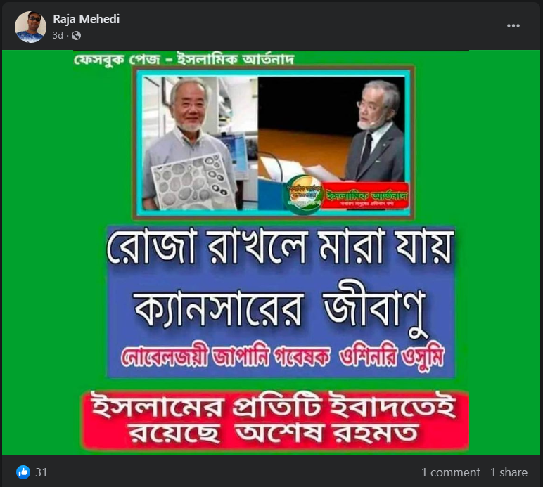Claim: নোবেল জয়ী জাপানের বিখ্যাত ডাক্তার ওসিনরি ওসুমি দাবি করেছেন উপবাস বা রোজা রাখলে সেরে যেতে পারে ক্যান্সার জীবাণু