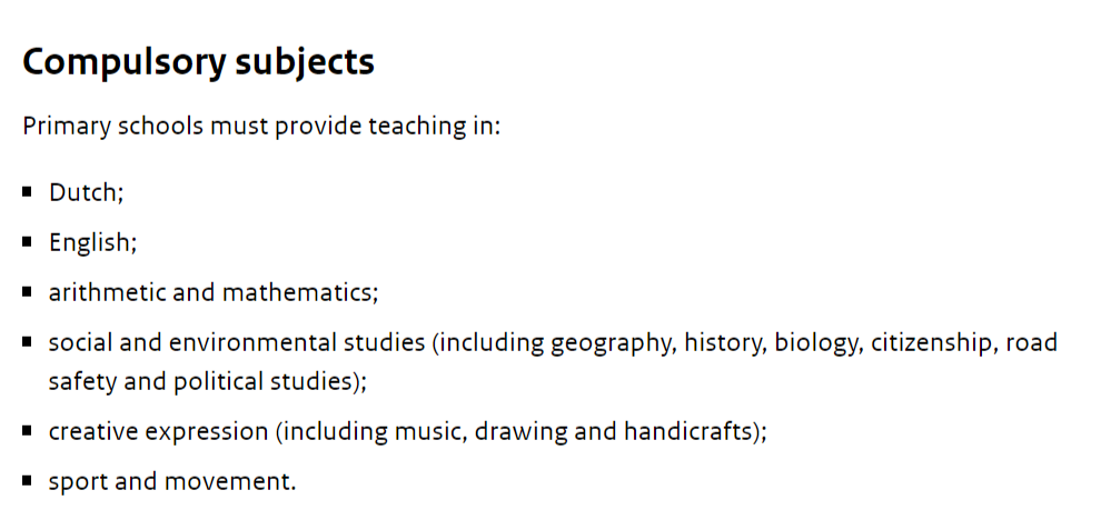 Government of Netherlands primary education – https://www.government.nl/topics/primary-education/subjects-and-attainment-targets-in-primary-education